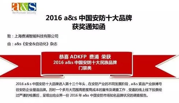 恭喜ADKFP 費(fèi)浦 榮獲2016 a&s 中國安防十大民族品牌門禁類