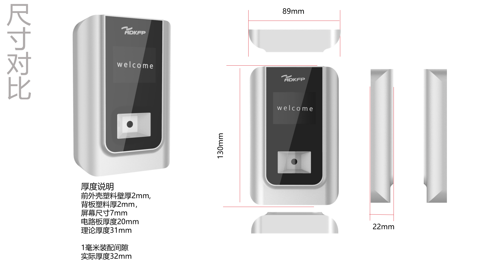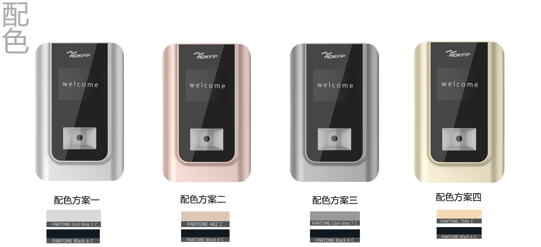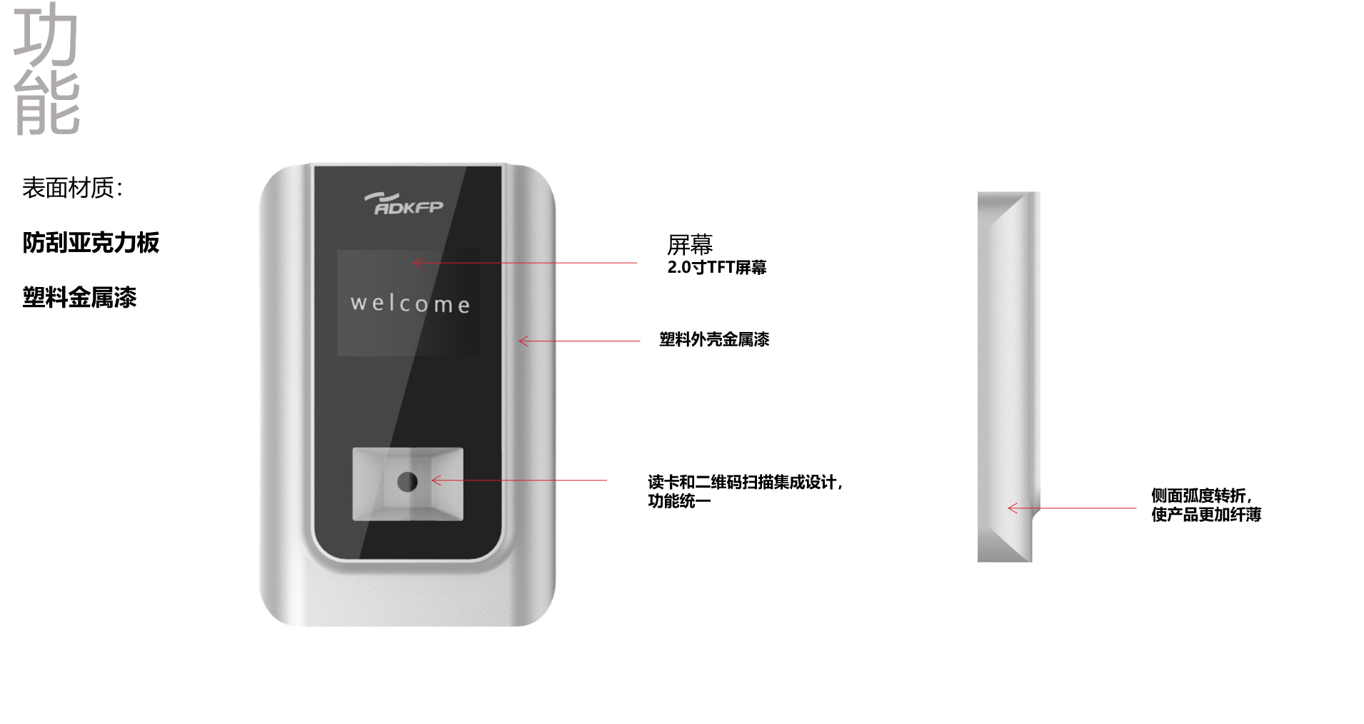 在CMF材料工藝的選擇上采用模出塑料外殼噴金屬漆,這與光面的亞克力板形成了強(qiáng)烈的視覺材質(zhì)對比,增加產(chǎn)品的造型感。同樣側(cè)面弧度轉(zhuǎn)角在視覺上使得本款門禁更加纖薄。